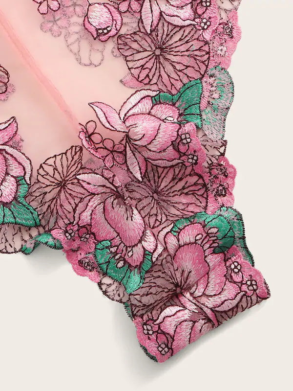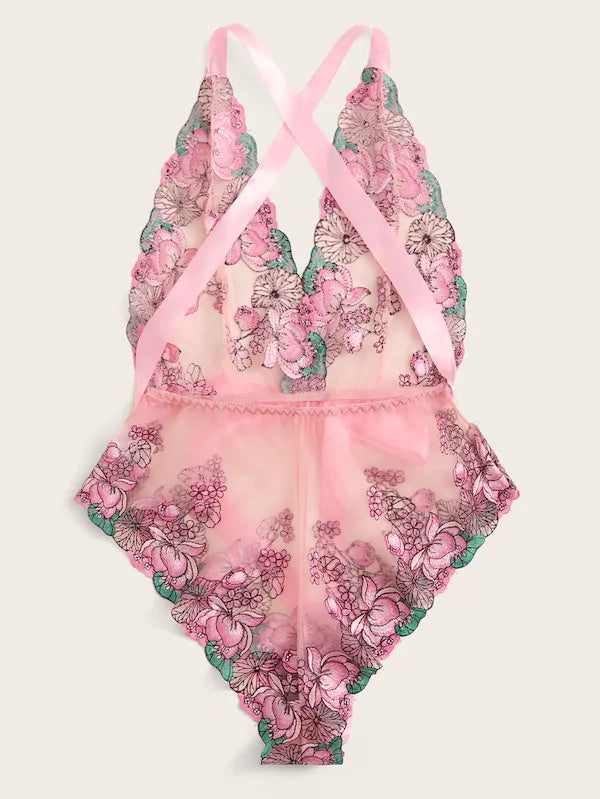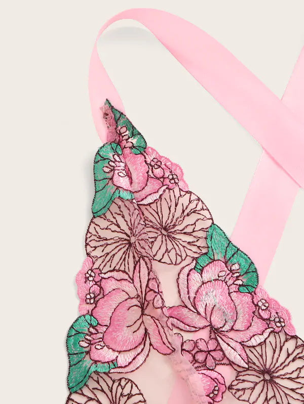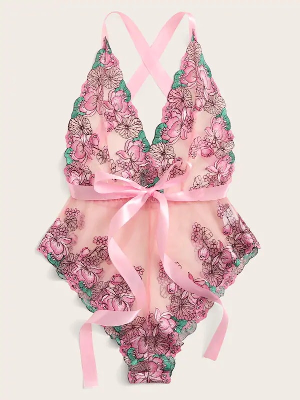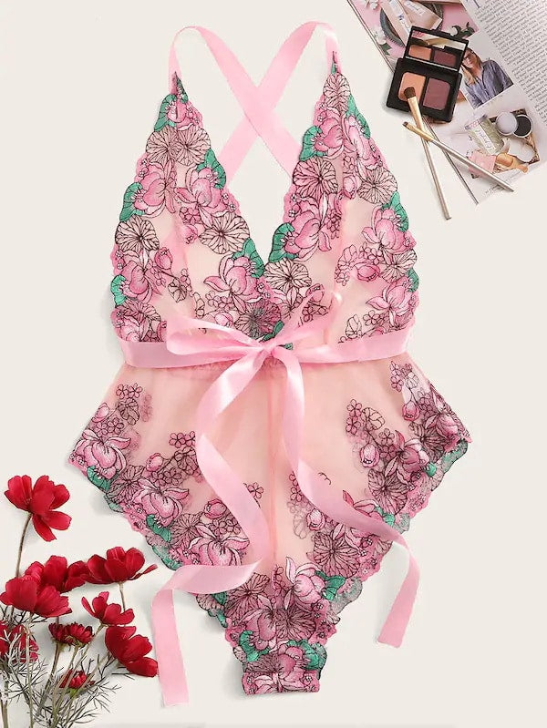 Pink Floral Front Tie Mesh Teddy Bodysuit